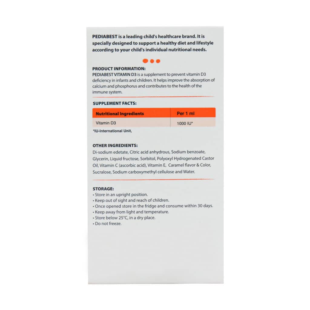 قطره ویتامین د3 پدیابست یک مکمل غذایی تخصصی جهت تامین ویتامین د مورد نیاز بدن شیرخواران و کودکان است. این قطره با دوز مناسب و طعم مطلوب، راهکاری ایمن و موثر جهت رشد طبیعی استخوانها، جذب بهتر کلسیم و فسفر، تقویت سیستم ایمنی بدن و پیشگیری از بیماری نرمی استخوان و پوکی استخوان به شمار میآید. میتوان گفت ویتامین دی از بدن در برابر دیابت، سرطان، آترواسکلروز، بیماریهای قلبی و افسردگی حفاظت میکند. علائم کمبود ویتامین د در کودکان، عدم رشد نرمال کودک، دیر دندان در آوردن کودک، دیر راه افتادن و کوتاهی قد او است که با خرید قطره ویتامین د پدیابست و استفاده منظم از آن حل خواهد شد.